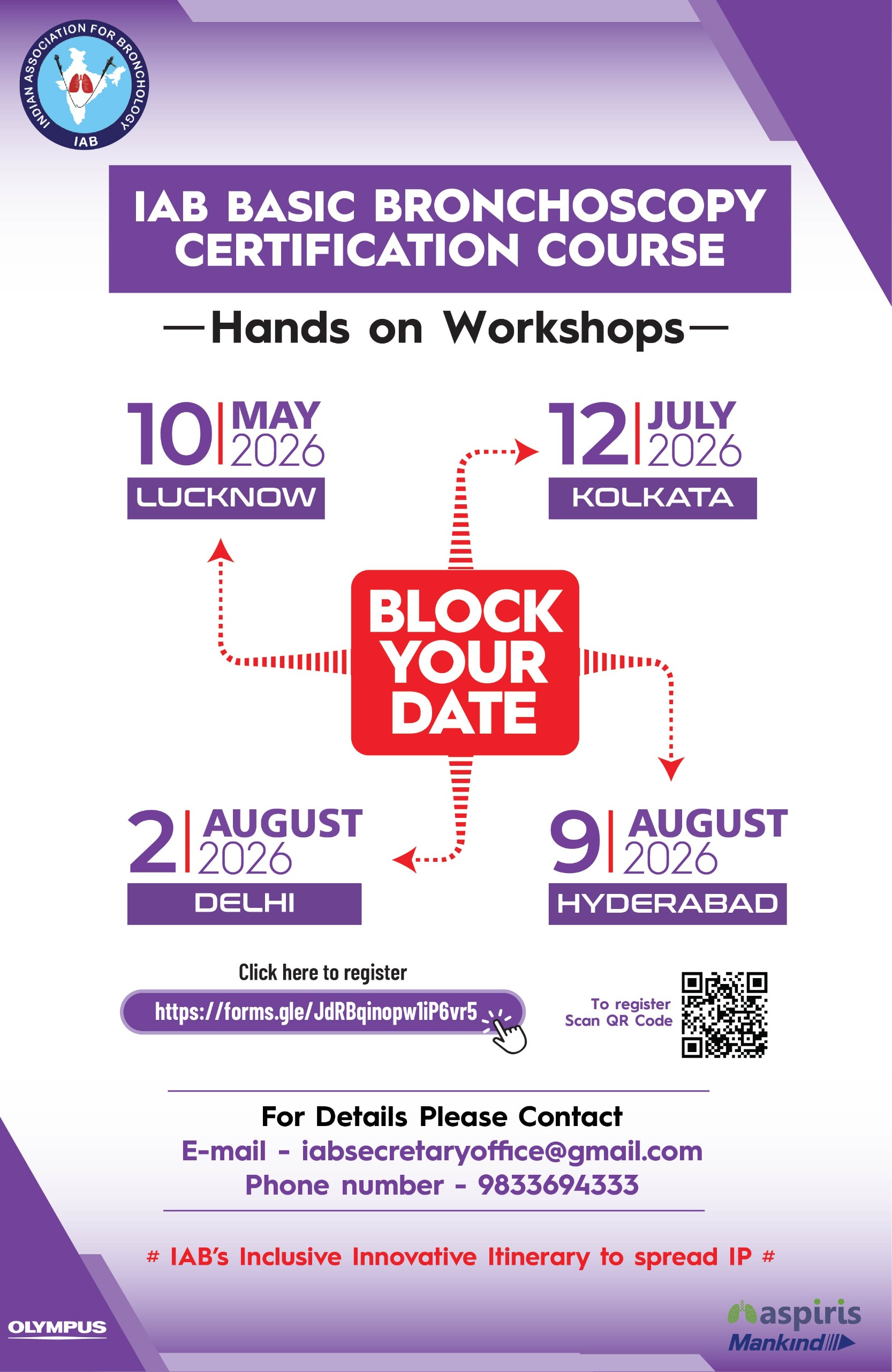 The Indian Association for Bronchology is our countryโs premier scientific society that sets the highest standards in academic excellence and clinical research in the fields of Bronchology and interventional Pulmonology.